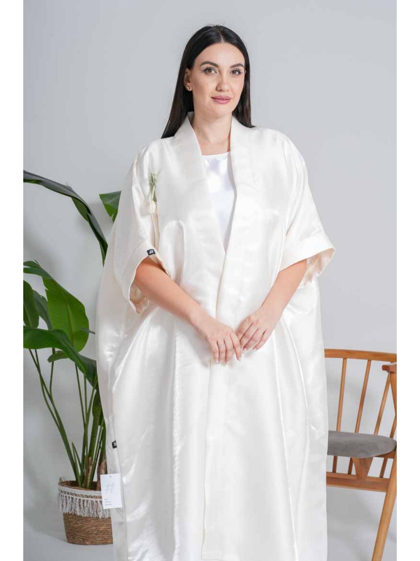 انغمسي في عالم من الرقة والصفاء مع هذا الكيمونو الفاخر. صُمم بقماش الساتان الحريري عالي الجودة الذي يتلألأ بلون العاج النقي، و ينسدل بأسلوب انسيابي واسع ليمنحك مظهراً مريحاً ومحتشماً في الوقت ذاته. القصة العصرية ذات الأكمام الواسعة القصيرة، بالإضافة إلى بروش الزهرة الرقيق بالقرب من الصدر، تضيف تفاصيل أنثوية راقية. يعتبر هذا الكيمونو قطعة مثالية لأجواء الاحتفالات والصباحيات الراقية، أو كإضافة ناعمة ومضيئة لأي ملابس سهرة.