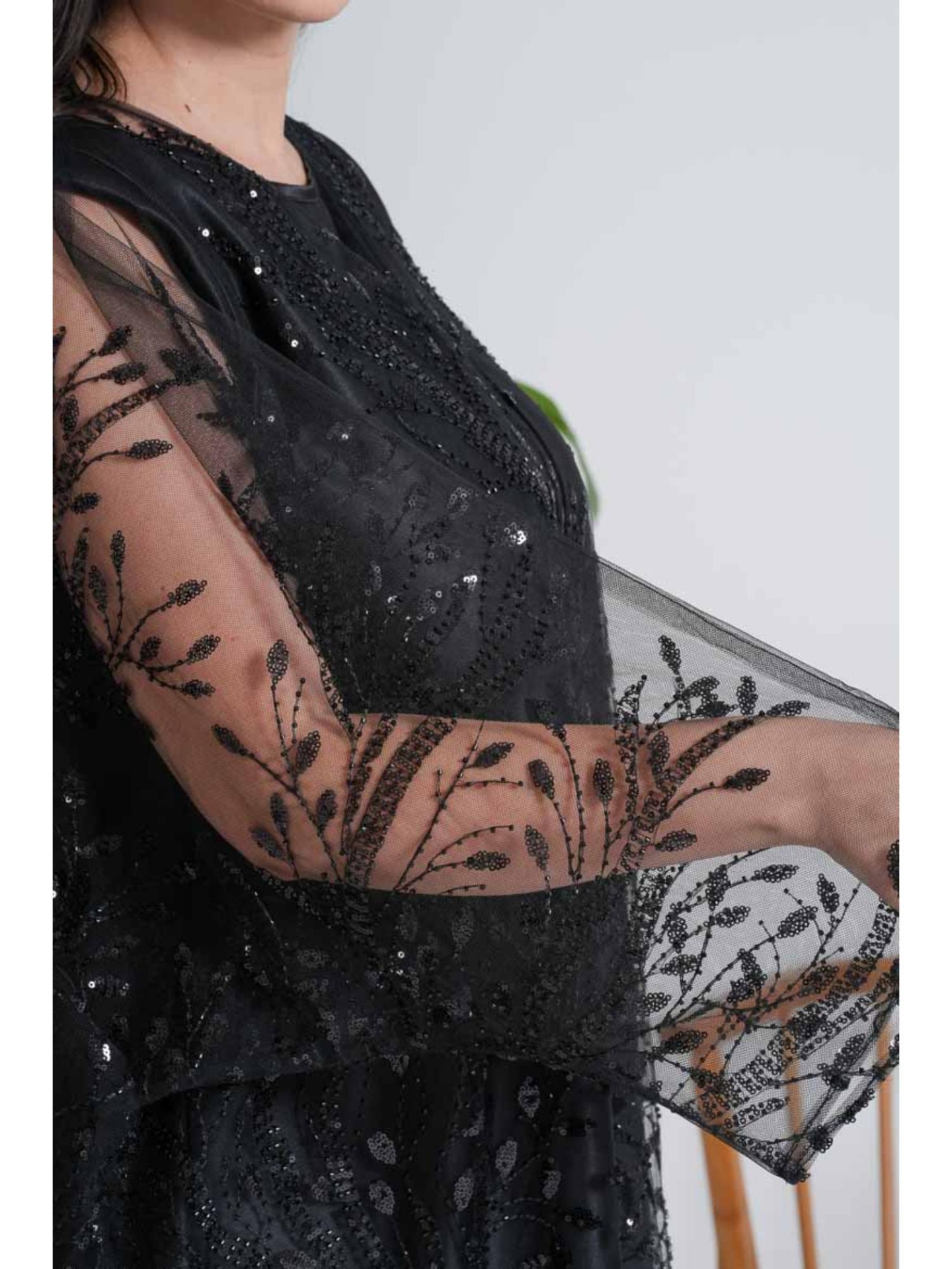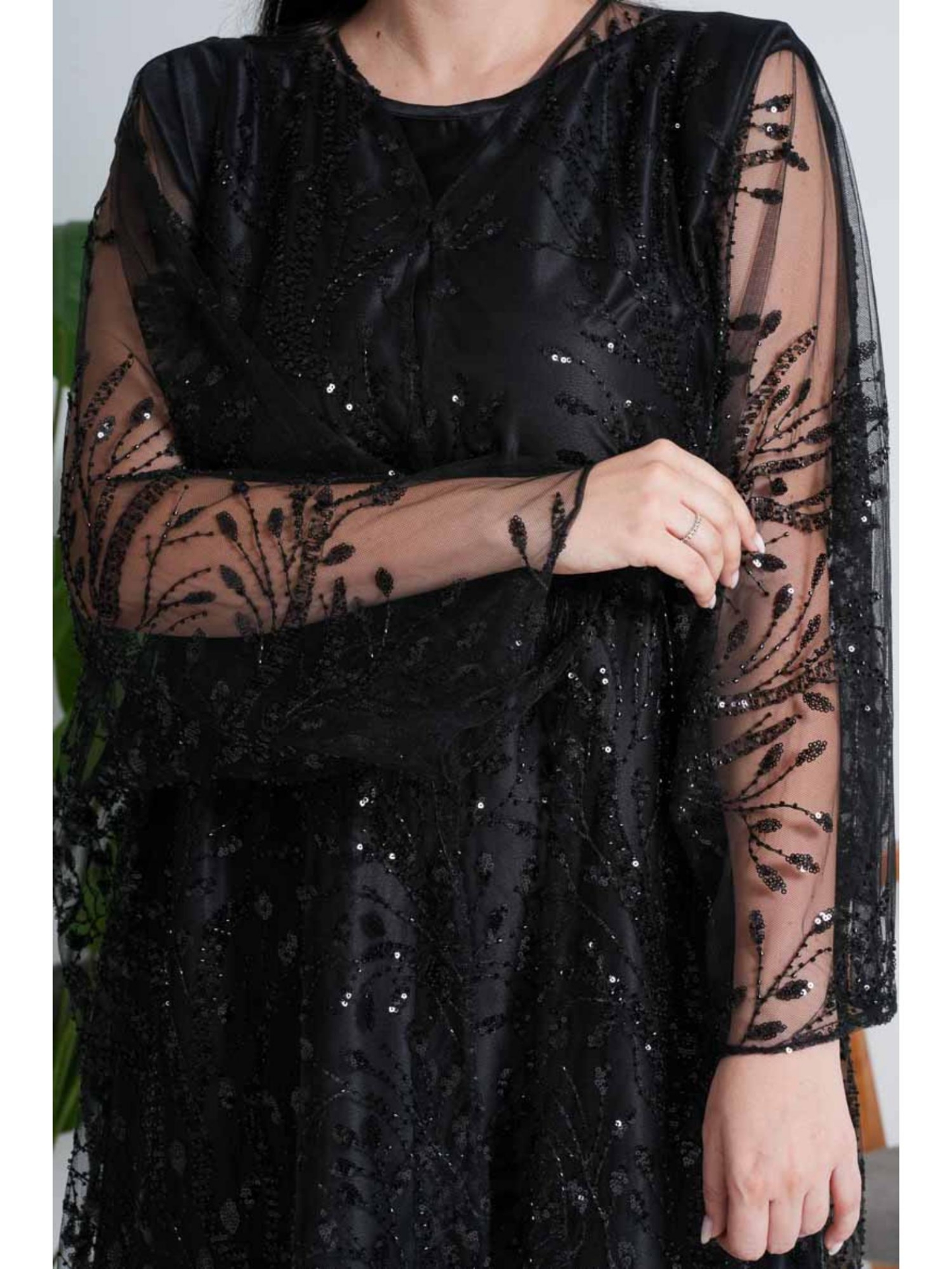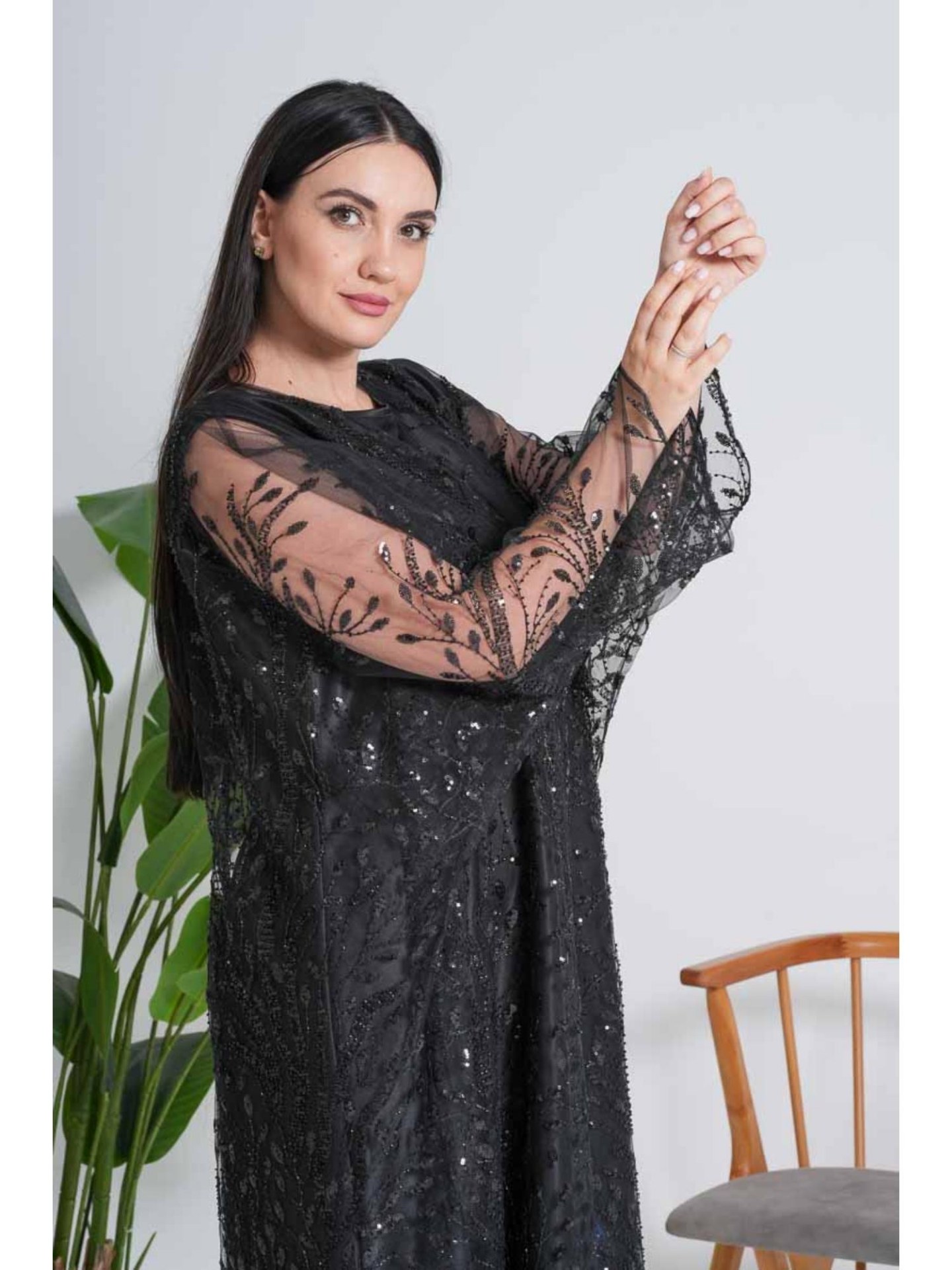 The "Black Tulle Evening Abaya" is the epitome of glamorous elegance and mystery. It features a unique two-layer design that ensures both modesty and luxury. The outer layer consists of sheer tulle fabric fully embroidered with black floral or ornamental patterns, highlighted with subtle shimmering threads and delicate sequins, which gives the abaya a three-dimensional effect and a hidden sparkle when moving. The inner layer is made of a solid, matte black fabric, providing the necessary coverage and emphasizing the intricate details of the sheer outer embroidery. The abaya boasts a comfortable, oversized fit with wide sleeves that take on a "batwing" or "butterfly" shape from the embroidered tulle, enhancing its drape and magnificent appearance. This abaya is the perfect choice for those seeking a regal look suitable for soirées and weddings without needing excessive accessories.