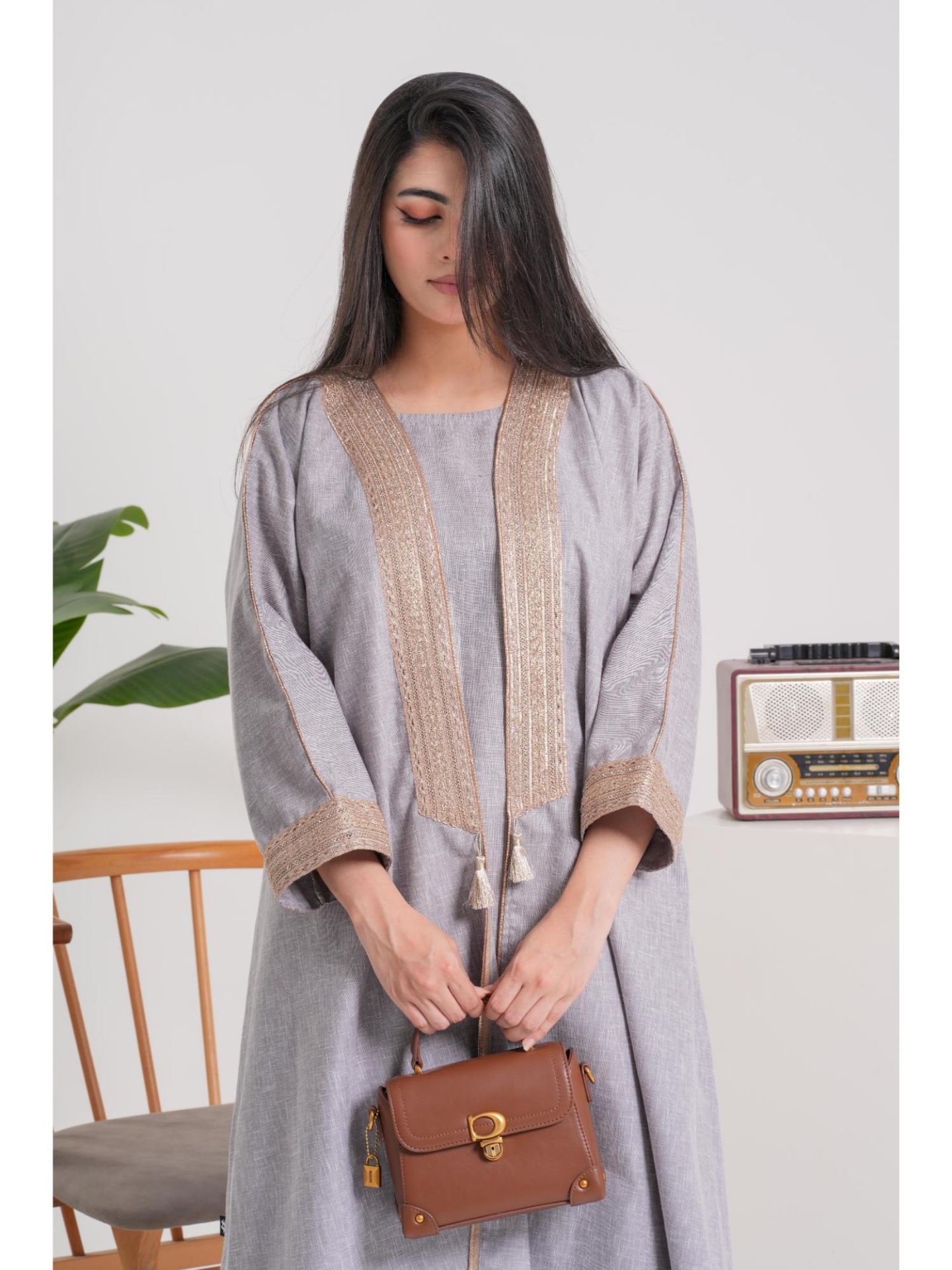 A contemporary classic abaya in a rich green color, made from a light and comfortable textured fabric. Its elegance lies in the hidden inner lining and fold-back edges, adorned with colorful floral patterns (pink, blue, yellow) on a white background. Perfect for daily wear, travel, or occasions requiring a modest look with a bright color splash.
