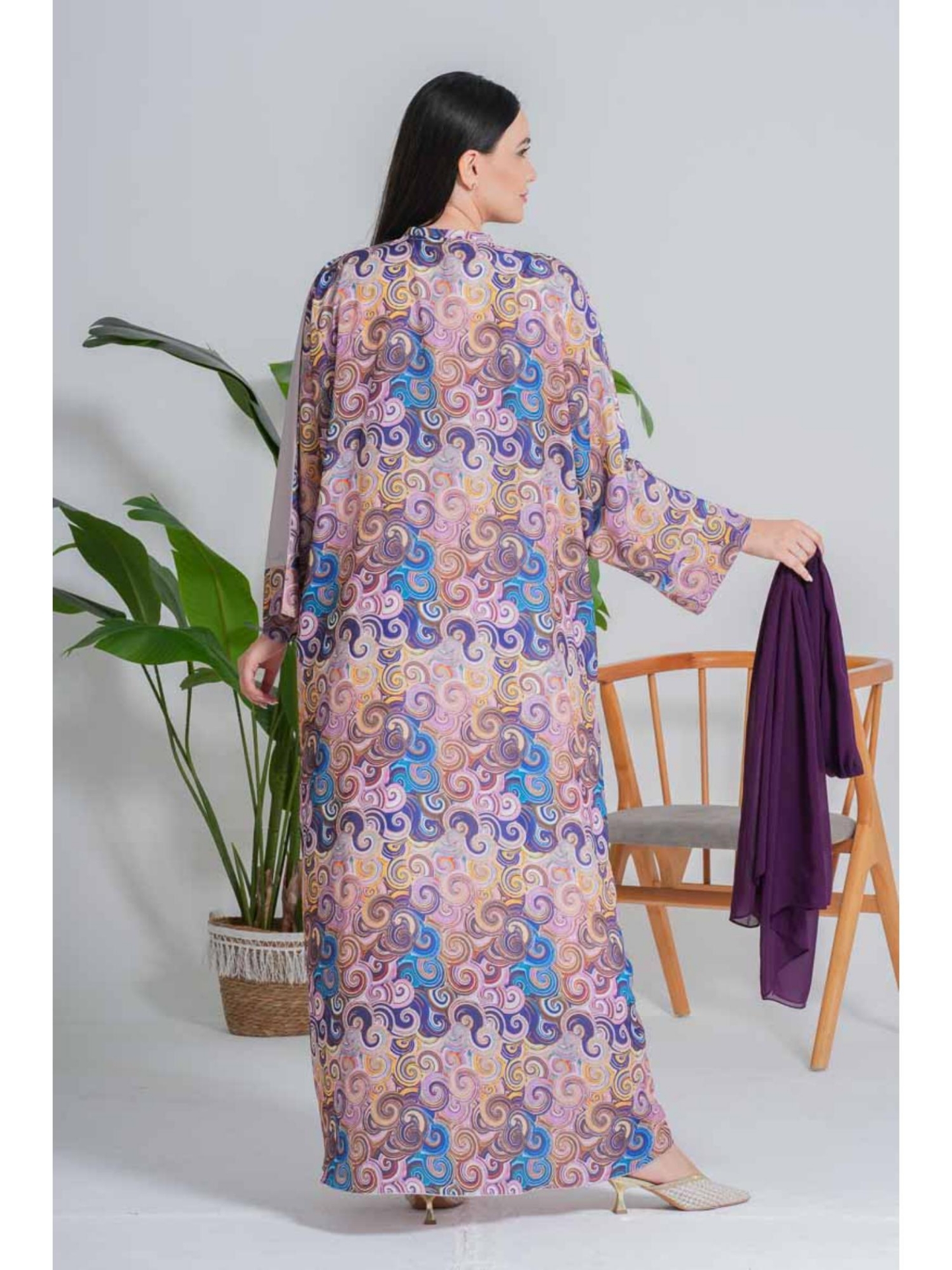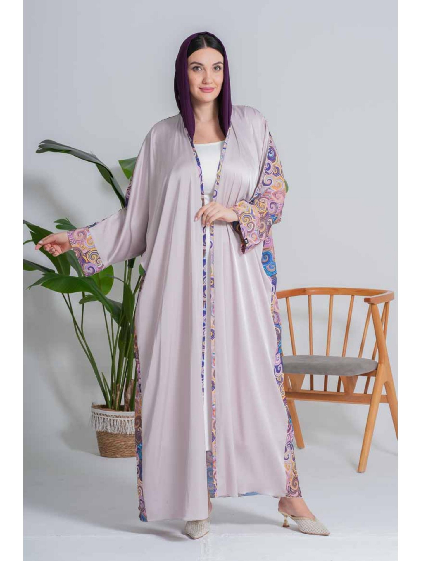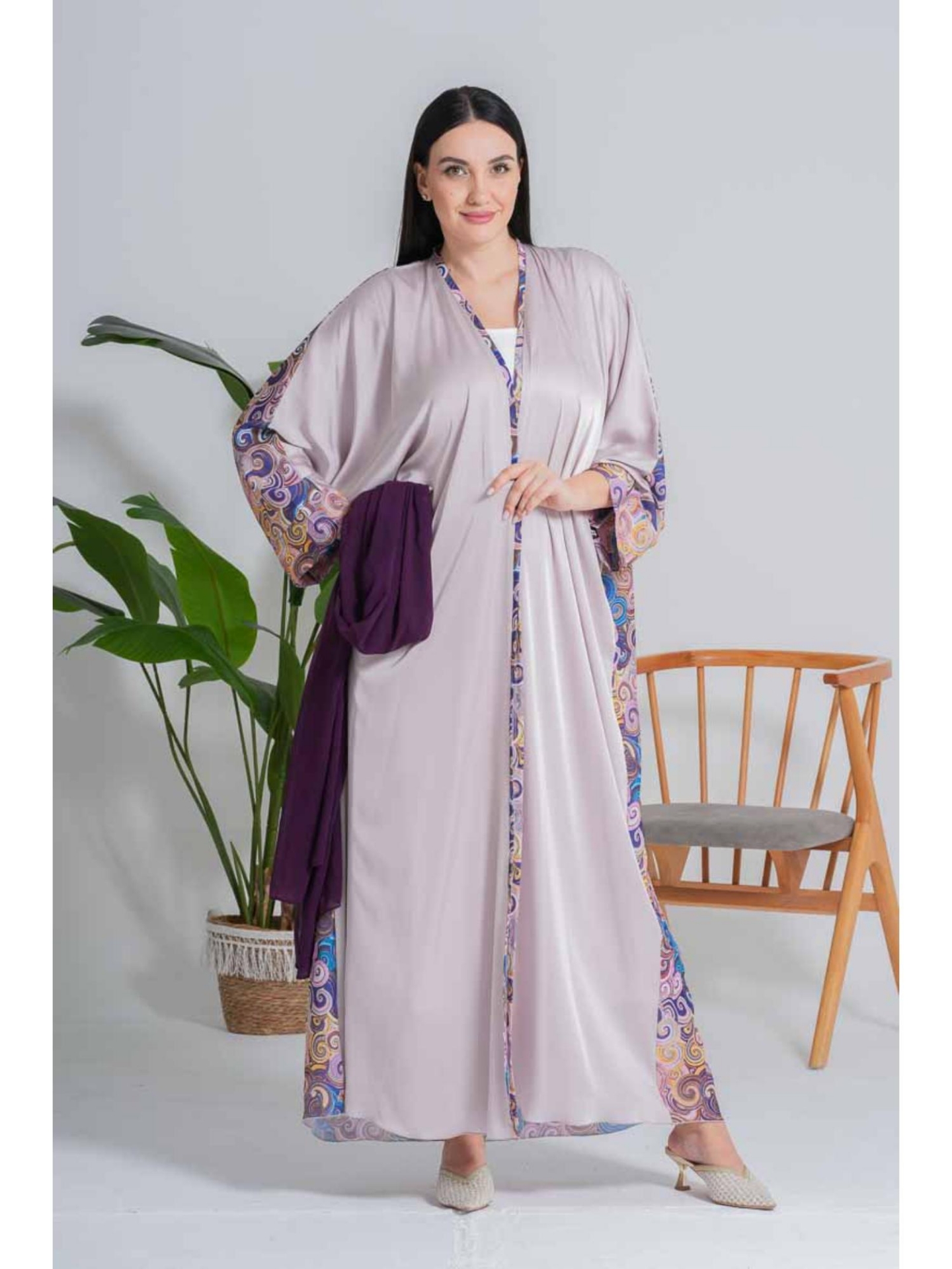 The "Sunset Hues Abaya" is a bold and unique choice that reflects a youthful and contemporary spirit. This abaya is made from a soft, shimmering fabric (such as satin or silk) in a calm lavender or mauve-gray hue, giving it wonderful fluidity and movement. The wide design and Kimono cut provide superior comfort and a modern look. The abaya's beauty is highlighted by the artistic, multi-colored prints in the form of swirls or overlapping watercolor lines in shades of blue, yellow, and pink, adorning the long cuffs and the side and front borders. These colorful details break the neutrality of the base color and make it a unique piece. It is very suitable for holidays, travel, or casual outings that require comfortable, non-traditional elegance.